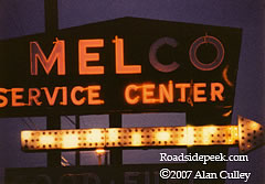 The Melco Service Center was located about 3 miles east of Hanna, IN and was always a conversation piece when we traveled to Chicago and back regarding how much of the sign would be lit. This was about the best I ever saw it. Melco was torn down and replaced by a larger convenience store/gas station and Arby's which is now out of business. 12-07