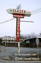 This is of the J. H. Glaser & Son Marine Supply Company, on Natural Bridge Road in St. Louis, Missouri. The business looks like it has been closed for a while now. Natural Bridge Road used to be a major route into the City of St. Louis from the suburbs in St. Louis County. The neighborhoods and small municipalities along this stretch of road are now run down and mostly abandoned. Most people avoid this area is possible taking the major highways downtown instead. There was certainly never any body of water nearby to warrant having a marine supply store in this part of town. A lack of well off middle class commuters (potential customers) passing by each day must have finally done them in. 12-06