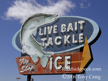 The letters for live bait and tackle feature prominently on the marquee at Pastikas in Hayward, WI. The fish and colors of the sign points the way into the shop. 03-06