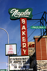 Located 6 blocks west of Wolf's Bakery is Naples Bakery, which was formerly located at 69th and Paulina in Chicago. Naples moved to Evergreen Park in the 1950's. There are two neon script signs that grace the facade o the building. During the holiday season, a neon sign hangs in the front window that reads Merry Christmas - Happy New Year. 04-07