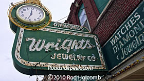 This is old sign for the Wright Jewelers is found in the Missouri town of Saint Joseph. This sign appears to be a throwback to the day and age when smaller shops along a main street were where you would purchase a gold chain or two. 10-10