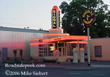 Here are a few photos of the Signal Gas in Portland, OR. This deco delight was recently restored to its earlier incarnation and the old petrol pump is for the most part largely intact. The neon is very prominent on this treasure of a building.