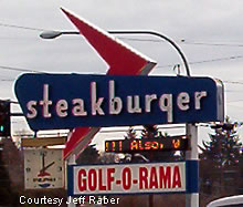 A huge and bold red boomerang sits atop the Steakburger sign in Hazel