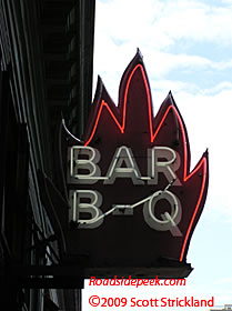 (Near right) A close up look at a Bar-B-Q specific sign also jutting out