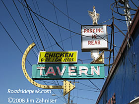 This Tacoma tavern features an old sign with a lot of different shapes going on. The place serves chicken to go. 11-08