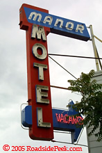 This red, white, and blue marquee advertises the Manor Motel in Ashland, OR.