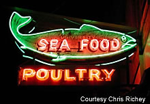 neon. Other signs include the Market Grill and University Seafood marquees below.