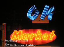 The neon on this market sign is more than OK. Check out the OK Market marquee with all of its letters well lit in neon in Medford, OR. 03-06