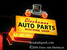 Check out this night shot of the Clackamas Auto Parts sign in Oregon City, OR. The little auto carriage atop the sign is nicely framed in neon. 03-06