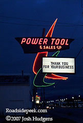The Power Tool sign boomerangs used to blink sequentially, however no longer does so. The sign has been repainted, covering the great pink and aqua scheme it used to be, but it is still easy on the eyes. 07-07