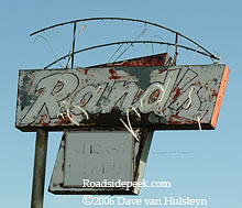 Here's a real eye-catcher of a sign found in Perry, UT. The sign in the lot for Maddox Ranch House features boomerang angles and small bulb lettering circling the main part of the sign. The restaurant, drive-in and steakhouse has been in business at this original location since August 1949. For more information, see the Maddox Ranch House website. 09-10