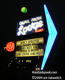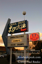 The Quail Park Lodge lets travelers know that the Kanab Cowboys High School football team just won the state championship. Check out the neon AAA emblem that also graces this sign as it catches the attention of motorists looking to make a stop for the night in the Utah town.