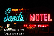 The Sun-N-Sand Motel in Kanab, UT has a neon lit marquee that points the way into the motel.