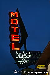 Most of the letters still lit up in this dusk shot of the Niagara House Motel sign. 07-07