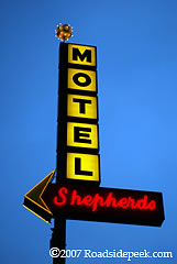 The little light ball on top of the sign glitters as the arrow points the way into the Shepherds Motel. 07-07
