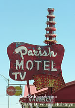 Check out this unique sign for the Parish Motel. The sign features some sort of a "leaning tower of Pisa" on top. This sign stands off the road in Burley, ID. 09-06