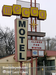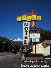UPDATE 01/08 : Here's a shot of the Mecca Motel marquee on a nice sunny day in the Rockies. Many thanks to Lizabeth Salinas of the