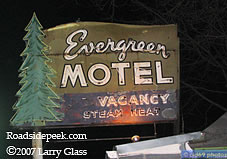 The roadside sign at the Evergreen Motel in Littleton, CO advertises its steam heat to prospective visitors. Yes, here's another motel with the Evergreen name. 10-07
