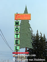 The Evergreen Gables Motel in Idaho Falls is located in a rustic area. The marquee in the shape of a pine tree just adds to the setting.