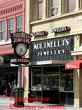 Along this block of old historic buildings is Molinelli's Jewelers. Check out the clock alongside the street that also advertises Molinelli's. 10-06
