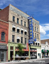 The Hotel Whitman of Pocatello, Idaho was first built in 1905 and once housed the Princess Theater and Eagles Lodge. Later the building was renovated to a hotel. The Hotel Whitman was formerly called the Hotel Nicollet. The Coffee Shop is housed in the front part of the building. The building also has a ghost sign on the side and can be seen from the street. 10-06