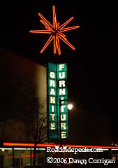 Here is a night shot of the Granite Furniture store sign, located in Salt Lake City, UT. Granite Furniture opened its first store at this pictured location in 1910. A real eye-catcher from the road is the Granite Furniture Hermier, the three-dimensional red starburst atop the marquee. 12-06