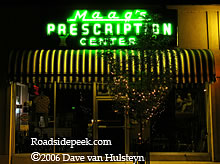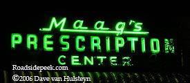 (Near left) The neon lettering of Maag's Prescription Center is all aglow