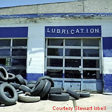 A pile of tires sit outside this old gas station located somewhere in Arkansas. The building looks to be falling apart and even the letters for "lubrication" are no longer in a straight line.