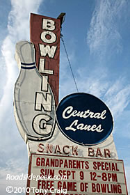 This old bowling marquee stands outside of the Central Lanes in Hot Springs, AR. This sign features a familiar bowling ball and pin theme. 11-10