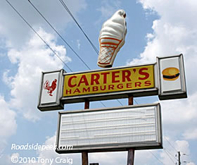 This is a familiar roadside sign that stands outside of Carter's Hamburgers in Alma, GA. Stop by here for a burger or two while you're traveling through Alma, GA. Just look for the ice cream cone on top of the tall sign. 11-10