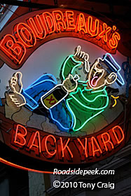 Located in the French Quarter district of New Orleans, the Boudreaux's Backyard sign features a guy enjoying his food and drink close to Bourbon Street. 11-10