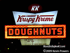(Near right) A close-up look at the combination backlit plastic and neon sign at the Krispy in Atlanta, GA