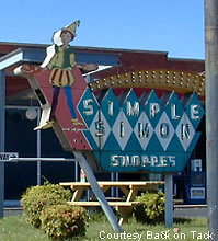 diners across from one another. Simple Simon, by all accounts, seems closed. A weird googie looking ball is mounted above the front door.