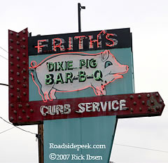 Frith's Bar-B-Q features a fine neon sign in Martinsville, VA. Check out the neon outline of the pig on the marquee of Frith's. This location also offers curb service. 08-07