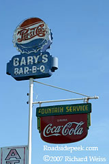 Check out this old Pepsi sign on top of the marquee at Gary's Bar-B-Q. The newer portion of the sign shows fountain service. Interesting how Coca-Cola is also being advertised. 11-07