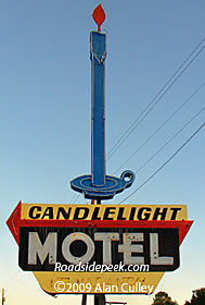 The Candlelight Motel in Ozark, AL features a fine roadside sign. The marquee shows of a lit up candle, fitting tot he motel's name. Not sure if the sign is of the neon variety though. 01-09