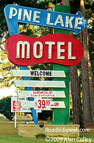 This marquee is located outside of the Pine Lake Motel. The motel features the colors and shapes of the mid-century era. Check out the way the arrow boomerangs over and the motel letters are in almost a kidney shape. 01-09
