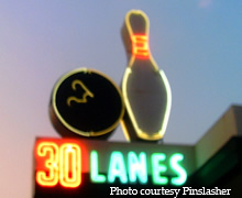 The bowling alley signs off the roads seem to draw in customers, especially when the neon is on. See the neon delights bowling style at Roadside Peek'sNeon Ten Pin Alleys.