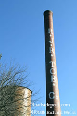 Danville, VA appears to be a tobacco city with a gigantic ancient complex of Camel and R J Reynolds factory buildings, some of which were beginning to be restored for other uses. The entire area is probably not much changed since the nineteenth century. Here you see the RJ Reynolds smoke stack (Identical to the one in Durham, NC) from this complex . 04-08