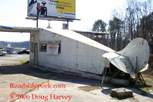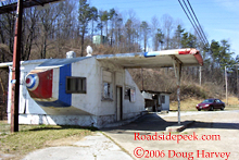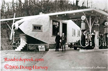 Here is an old gas station in Powell Tennessee (north of Knoxville) that was built to look like an Airplane. It sits on U.S. 25W and was built in 1930 by the Nickle brothers and was in operation until the 70's. There is a local effort to save and restore it. The brothers advertised the station on the reverse side of business cards that Harland Sanders used to promote his restaurant and motel in Corbin, KY. Harland Sanders is better known as Colonel Sanders of Kentucky Fried Chicken fame. Many thanks to Doug Harvey for information. 03-06