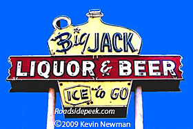 Here's a gem of a roadside sign found in the town of Boston, KY. Located off the "Bourbon Trail", Big Jack Liquor & Beer features a huge jug of a sign. This big jug is so tempting that Whitey and the Beaver would like the photographer to climb up and see what's inside. 11-09