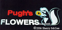 This skunk holds the bouquet on this sign for Pugh's Flowers. Let's see... skunk... Pugh's. I get it. 09-06