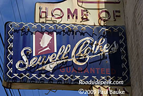 (Far left) The front facade and blade sign for the Sewell Manufacturing Co.