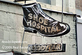 This Shoe Hospital sign is found in downtown Birmingham, AL. It's interesting how a shoe hospital also has an old neon sign for Goodyear right underneath. Perhaps Goodyear rubber is used to repair the shoes? Now that's a real reach. 04-09