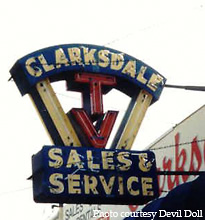 This old roadside sign sits outside of the Clarksdale Sales and