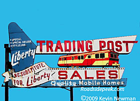 UPDATE 05/09 : Here's an old sign for the Liberty Trading Post shown in full color. The sign is creatively shaped like an airplane and today advertises "quality mobile homes". Many thanks to Kevin Newman for color photo. 05-09