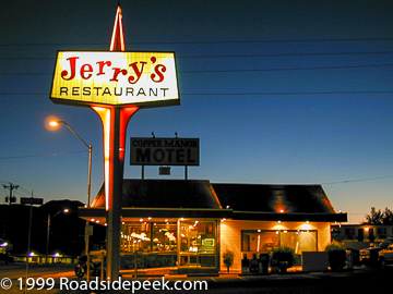 Here's is Jerry's Restaurant in a shot from the late 1990's with the Copper Manor motel sign in the background. Jerry's used to be a restaurant and coffee shop chain and was known for their distinct signs, and food of course. This Jerry's is now gone. A Joe's Ribs is now at this location. Oh and by the way, the Copper Manor is now a Nite Inn. 06-23