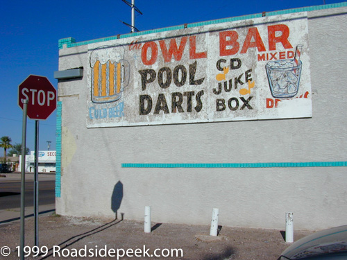 Looking to stop and shoot some pool and throw darts while passing through Gila Bend, AZ. This is the Owl Bar. Check out the sign on the side of the building.