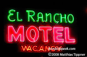 The El Rancho Motel still features full neon lettering on its sign at the east end of the Route 66 downtown stretch of Williams, AZ. 01-09