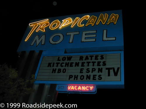 Here is the neon lit marquee for the Tropicana Motel. The lit up sign was more impressive than the motel grounds. Word is this motel originally opened its doors in 1958. 12-06